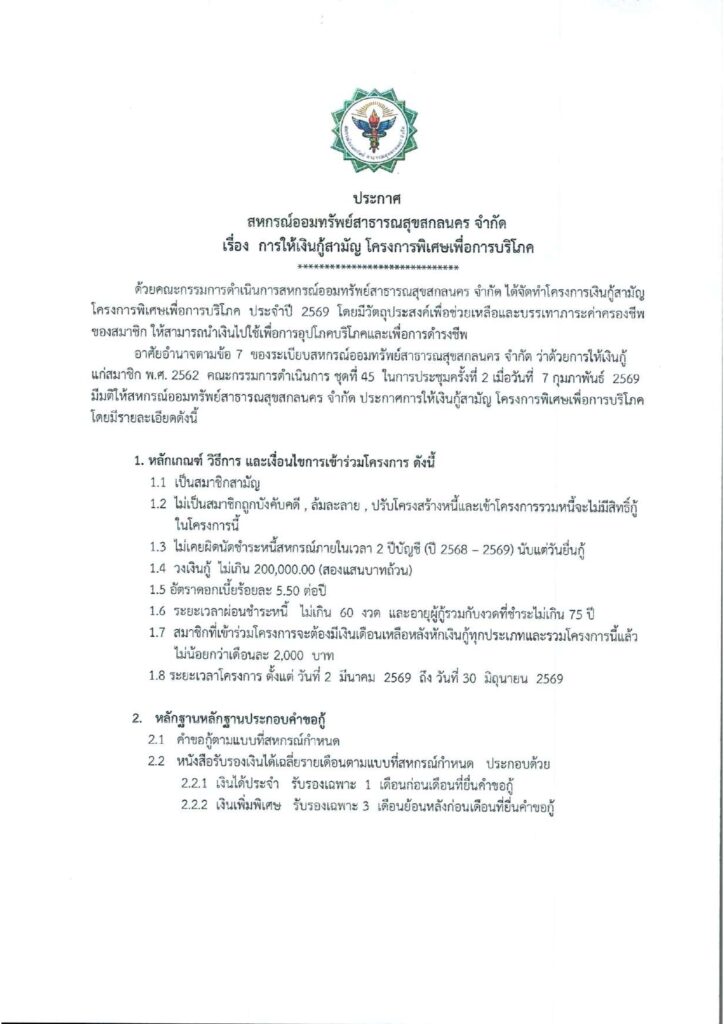 ประกาศ ประกาศ เงินกู้สามัญโครงการพิเศษเพื่อการบริโภค 11 ก.พ. ดาวน์โหลดเอกสาร คำสั่งแต่งตั้งคณะกรรมการชุดที่ 45 ประกาศ ระเบียบสหกรณ์ฯ ว่าด้วยทุนสวัสดิการสมาชิก แก้ไขเพิ่มเติม (ฉบับที่ 2) พ.ศ.2569