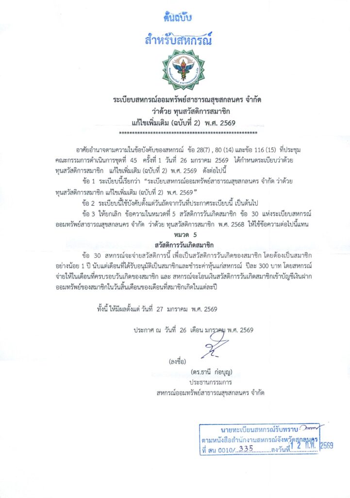 ประกาศ ประกาศ ระเบียบสหกรณ์ฯ ว่าด้วยทุนสวัสดิการสมาชิก แก้ไขเพิ่มเติม (ฉบับที่ 2) พ.ศ.2569 18 ก.พ. ประกาศ เงินกู้สามัญโครงการพิเศษเพื่อการบริโภค ประกาศ ข้อบังคับสหกรณ์ฯ แก้ไขเพิ่มเติม (ฉบับที่ 2) พ.ศ.2569